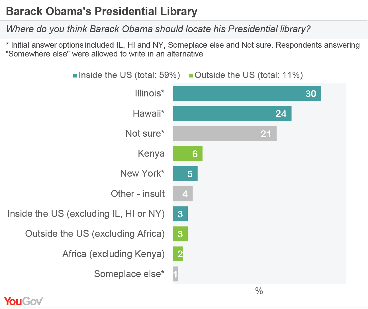 Americans in a recent YouGov Poll gave Chicago a small edge, but not without a birther argument. 11% said the library should be outside the United States, with most of those siting it in Kenya or elsewhere in Africa.