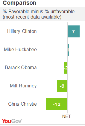 And for comparison: potential Democratic 2016 candidate Hillary Clinton looks formidable as ever. Though her favorability ratings declined throughout the second half of 2013, they do appear to be making a comeback and have averaged 50% favorable to 43% unfavorable over the past four weeks, including an average of 28% ‘very favorable’ views, giving the former Secretary of State a sizable advantage over the former governor and the highest ratings of any politician appearing in recent polls.