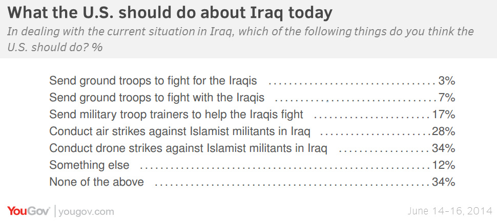 As for what to do now, there is little support for any offered alternative. Hardly any Americans would send troops to fight – and just 17% would send U.S. troops even to train Iraqi forces. Air strikes get more support, but only a third would support drone strikes, somewhat more than the percentage favoring manned air strikes. One in three would take no action. Support for sending troops to Iraq is low regardless of circumstances, but if the Iraqi government requested assistance, a recent YouGov survey shows that half the country would support air strikes (48%) and drone strikes (52%).