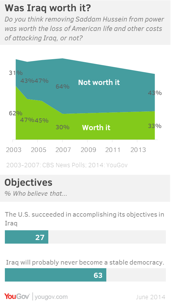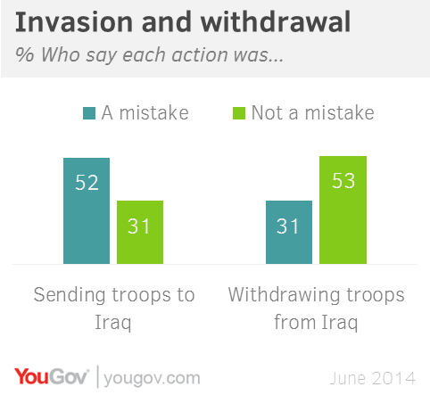 The capture of multiple cities in Iraq by Islamist militants from a group called the Islamic State in Iraq and Syria (ISIS) and the possibility of sectarian warfare between Sunni and Shiite branches of Islam doesn’t seem to have changed Americans minds about the U.S. invasion of Iraq and the later troop withdrawal. Majorities of the public in the latest Economist/YouGov Poll say the original U.S. involvement was a mistake, and the withdrawal of U.S. troops at the end of 2011 was not.