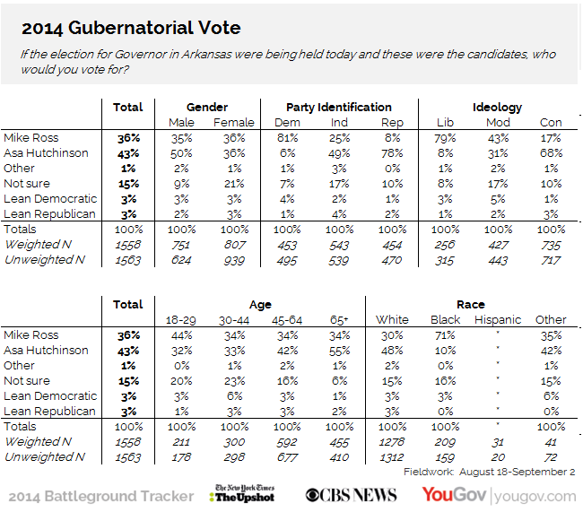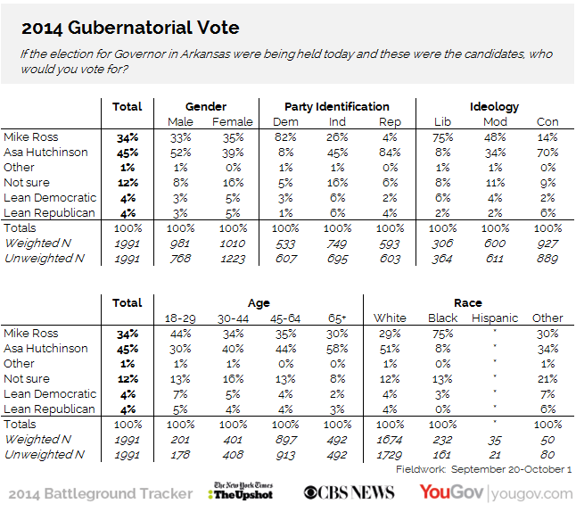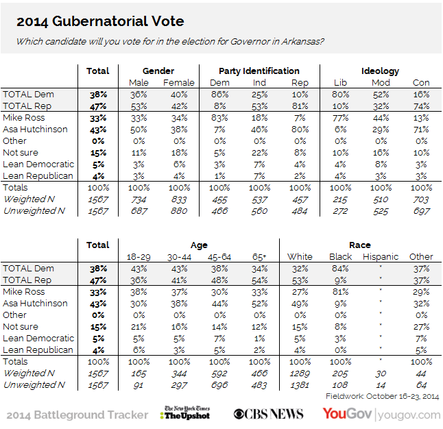 Battleground Tracker 2014: ArkansasIn:CBS/YouGov BattlegroundPolitics & current affairsSeptember 07, 2014, 2:25 p.m.In:CBS/YouGov BattlegroundPolitics & current affairsSeptember 07, 2014, 2:25 p.m.YouGovFull data from likely voters for the 2014 New York Times / CBS News / YouGov Battleground Tracker. Share this article