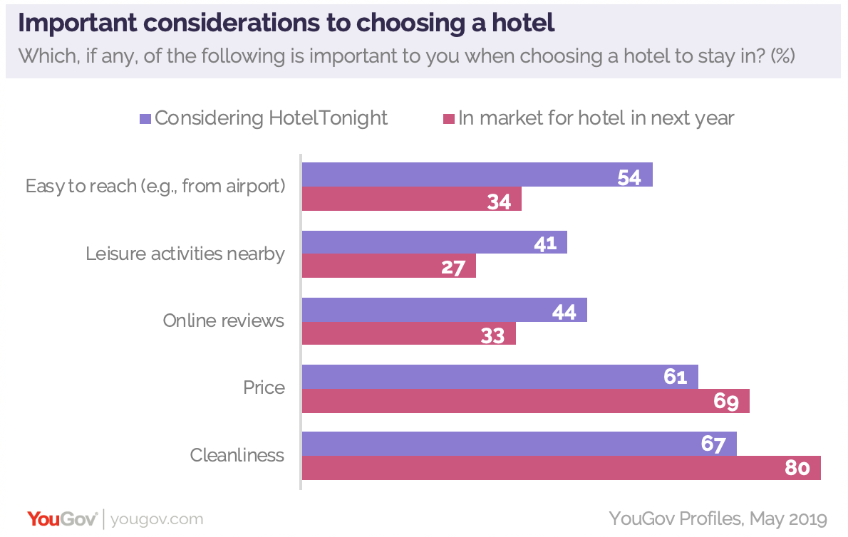 Those considering HotelTonight also hold some distinct consumer preferences. This group is more likely than those who indicate they are in the market for a hotel to say that the hotel should be easy to reach (54% vs. 34%), have leisure activities nearby (41% vs. 27%), and have online reviews (44% vs. 33%). This group is also more flexible in their demands on hotel brands, as they are less likely to be impacted by price and cleanliness when compared to those in the market for a hotel room.