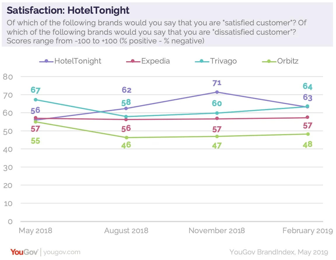 A travel brand’s success often hinges on customer satisfaction, especially in a world where you can leave a review on just about anything. According to YouGov BrandIndex data, HotelTonight customers express some of the highest rates of Satisfaction when compared with customers of other prominent booking agencies.